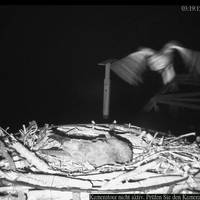 Und wieder zeigt sich eine kleine Eule (ist es die Schleiereule?) in der Nacht. Sie wartet erst wenige Augenblicke rechts hinter dem Horst, wo das Bussard-Weibchen auf den zwei Eier sitzt.
